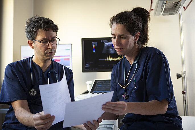 Die Oberärzte Dr. med. Jan Kaiser und Giovanni Visciani gehen jedem Anfangsverdacht mit Ultraschall nach. Blutuntersuchungen, Nierenbiopsie und genetische Untersuchungen ergänzen die Diagnostik. Ob Fehlbildungen der Nieren, erweiterte oder verengte Harnwege, eine Nierenbeckenerweiterung, Autoimmunerkrankungen, Stoffwechselstörungen, Zystennieren oder Nierensteine – das Spektrum an möglichen Erkrankungen ist sehr weit und auch die Schwere der Erkrankungen ist unterschiedlich ausgeprägt. Genau dies macht für die beiden den Reiz an der Nephrologie aus: „Gerade bei der Erstvorstellung ist Detektivarbeit gefragt, denn manche seltenen Erkrankungen sind sehr komplex in der Diagnostik. Das ist für uns als Ärzte sehr spannend und herausfordernd“, beschreibt Jan Kaiser sein Interesse für die Nephrologie.