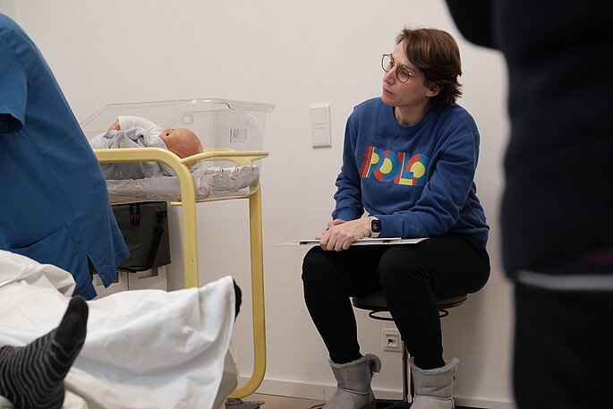 Während Ärztin und Pflegekräfte die Patientin versorgen, klatscht jemand in die Hände, gefolgt von einem „Szenario stopp!“. Dr. Maria Perez de Laborda hat das Geschehen rund um das Patientenbett im Hintergrund verfolgt. Die Frauenärztin verantwortet die Simulationstrainings der Frauenklinik und der geburtshilflichen Stationen. „Die Simulationstrainings sind fester Bestandteil in der Dienstplanung des Bereichs Geburtshilfe: Alle Pflegekräfte erhalten mindestens einmal jährlich ein ganztägiges Simulationstraining, die Ärztinnen und Ärzte zweimal im Jahr“, erklärt die Oberärztin.